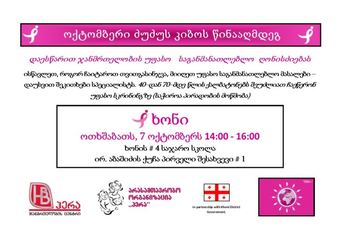ოქტომბერი – ძუძუს კიბოს წინააღმდეგ ბრძოლის თვეა და ამასთან დაკავშირებით, ქალთა ჯანმრთელობისა და კეთილდღეობის ზრუნვის კავშირი “ჰერასა” და აშშ–ს “მშვიდობის კორპუსის” თანამშრომლობით, ჩატარდა ტრენინგი ძუძუს ჯანმრთელობის საკითხებთან დაკავშირებით, ხონში. თანამშრომლებისა და მოხალისეების მიერ განხილული იქნა ჯანდაცვის სერვისებისა და განათლების ხელმისაწვდომობის გაუმჯობესება რეგიონებში. “ჰერას” და ხონის # 4 საჯარო სკოლის მიერ მოწვეული იქნა სკოლის პედაგოგები და ადგილობრივი ქალბატონები, რათა დასწრებოდნენ აღნიშნულ ტრენინგს, რომელიც ერთი საათი გაგრძელდა. პედაგოგთა უმეტესობა დიდი ენთუზიაზმით შემოუერთდნენ ტრენინგს, მიუხედავად წვიმიანი ამინდისა, არ შეუშინდნენ ფეხით სავალ გზას სკოლამდე. პრეზეტანციას უძღვებოდა “ჰერას” აღმასრულებელი დირექტორი, ექიმი – ქალბატონი მარინე დავითულიანი. მან აღნიშნა ძუძუს რეგულარული თვით–გასინჯვისა და კლინიკური გასინჯვისა და მამოგრაფიული სკრინინგის უდიდესი მნიშვნელობის შესახებ. ქალბატონმა მარინემ უპასუხა შეკითხვებს და ქალბატონებს გადასცა ბეჭდვითი მასალები მათთვისაც, ვინც ვერ მოახერხა ტრენინგზე მოსვლა. ღონისძიება წარმატებული გამოვიდა და ამჟამად მიმდინარეობს მოხალისეთა მუშაობა თავიანთ პარტნიორებთან, რათა მოგვარდეს იმ ქალბატონების ტრანსპორტირება კლინიკა “ჰერაში” ვისაც სურს უფასო მამოგრაფიული სკრინინგის მიღება.